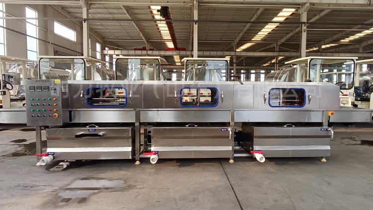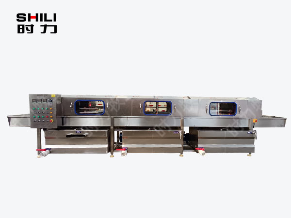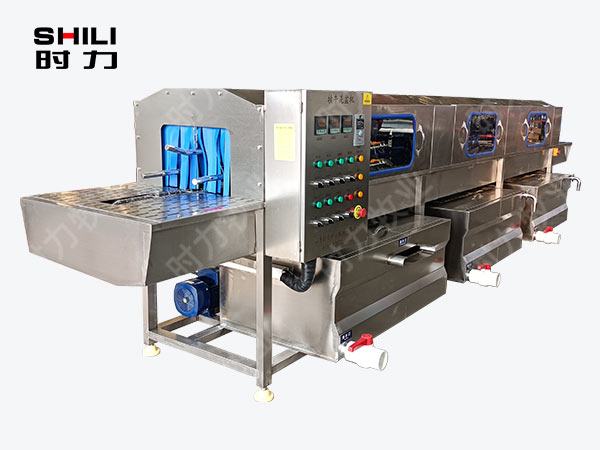 整機采用四面噴淋,三段清洗,第一段為熱堿水,第二段為熱清水,第三段為自來清水,熱水箱兩段內分別設有電加熱管道;帶有溫度控制裝置,溫度從常溫至90°C自由設定。各個循環水箱均采用臥式加立式不銹鋼離心水泵循環噴淋,從上、下、左、右,四個方向同時對產品進行噴淋沖洗;需清洗的產品由不銹鋼鏈條輸入清洗機中,依次通過人工上桶→ 自動除渣→高壓主洗→高溫預漂洗→高溫清水漂洗連續式清洗;每個水箱均設有過濾網裝置,便于隨時清理。