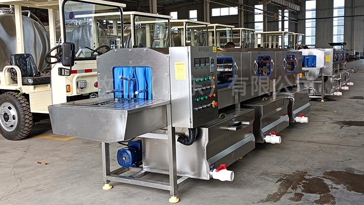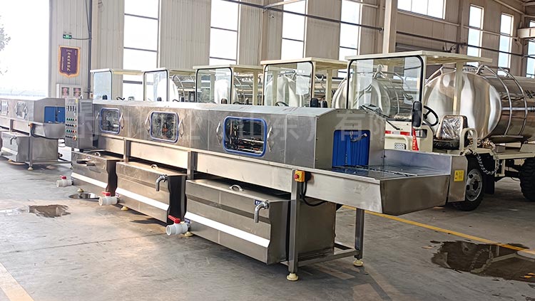 和國內多個大型牧場建立合作關系,整機設備采用折彎式水箱,水箱內部加裝過濾網,自動補水,水箱上端加蓋子節約能源,內部采用電加熱,水位可控,電加熱自動保護,變頻調速電機,根據現場實際情況進行速度的調節,可控溫,調溫,所有水泵均采用不銹鋼泵頭,水泵進口處加裝二次過濾,內部所有噴淋管全部是快拆式結構,防止噴淋管阻塞,噴頭可以360度調節,雙卡扣,每道清洗處均采用軟簾連接,防止串水,整機采用sus304不銹鋼制造。